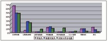 圖2 從2001年7月-2002年6月調研10家單探頭用戶、5家普通雙探頭用戶和30家雙探頭可變角度帶有符合電路用戶臨床檢查類型的數(shù)據(jù)。為了便于比較,采用相對數(shù)的方法。可以看出對于單探頭用戶在臨床主要用于骨掃描和甲狀腺檢查。對于雙探頭帶有符合電路系統(tǒng)的用戶,骨掃描46%、心肌血流灌注23%、符合電路10%、甲狀腺9%、心肌代謝7%、GA-67為2%,其它(腎臟、肝等)3%。可以看出雙探頭符合電路系統(tǒng)最大的貢獻是為臨床開拓出20%新的檢查項目,最為重要的是這些檢查項目將成為主流臨床檢查。這可能是雙探頭(多探頭)符合電路在國內急劇增加的主要原因。