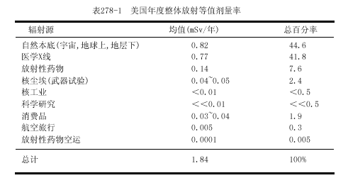 常用的測量單位是倫琴,戈瑞(Gy)和希沃特(Sv).倫琴(R)是空氣中x或γ電離輻射的計量單位,戈瑞是被各組織或物質(zhì)吸收的能量計量單位,它可應用于各類輻射.R和厘戈瑞(cGy)基本上是相等的.在說明生物學效應時,Sv與經(jīng)質(zhì)量因子校正的Gy相等.因為對一定量的能量而言,不同類型的輻射可產(chǎn)生不同的生物學效應;例如,中子有較大的效應.對X和γ輻射,Sv與Gy相等.在現(xiàn)代術語中Gy和Sv已替代拉德(rad)和雷姆(rem),Gy=100rad,Sv=100rem.在非專業(yè)刊物中常常將輻射分為低水平輻射(0.2~0.3Gy)和高水平輻射(>0.3Gy).而醫(yī)學劑量一般為<0.05Gy,而且常常<0.01Gy.地球及其大氣的本底放射活性水平很低,而不能測知其效應(表278-1).