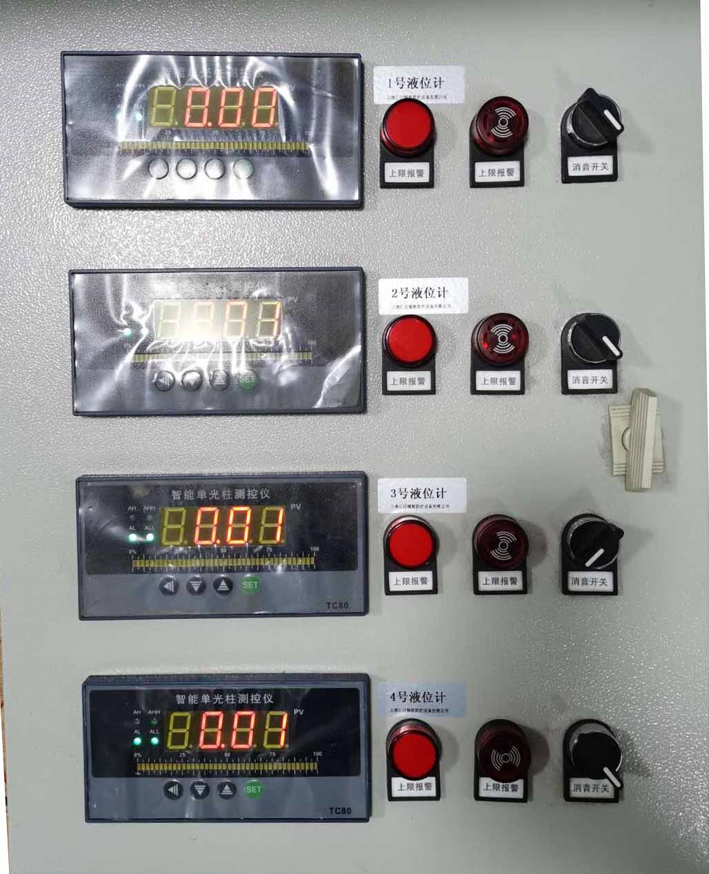 控制柜內(nèi)部嵌入有多個液位變聲器控制主機,該主機能實時采集液位變送器的數(shù)據(jù),并更加設定的報警閾值給出 上下限閾值聲光報警的功能